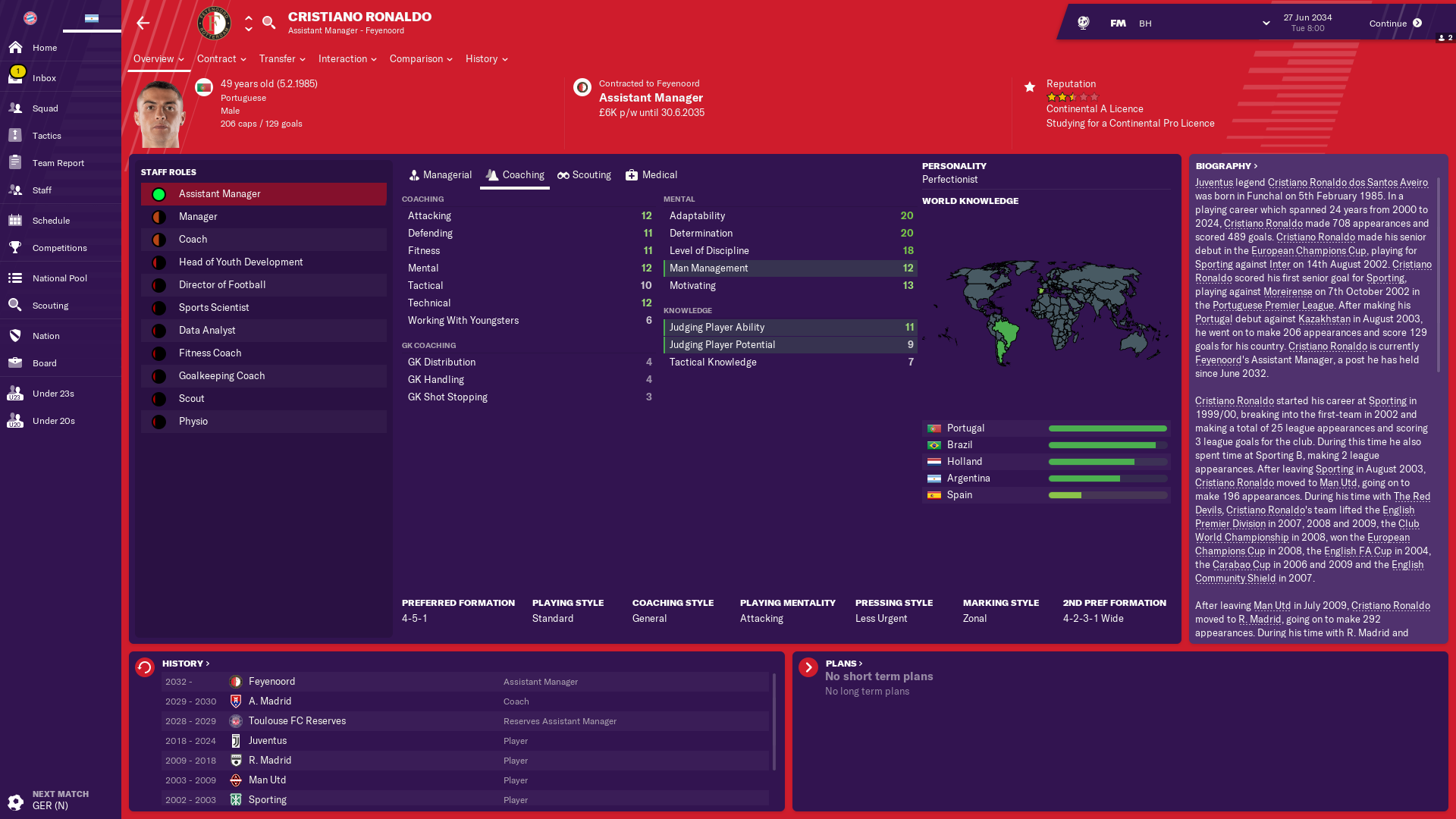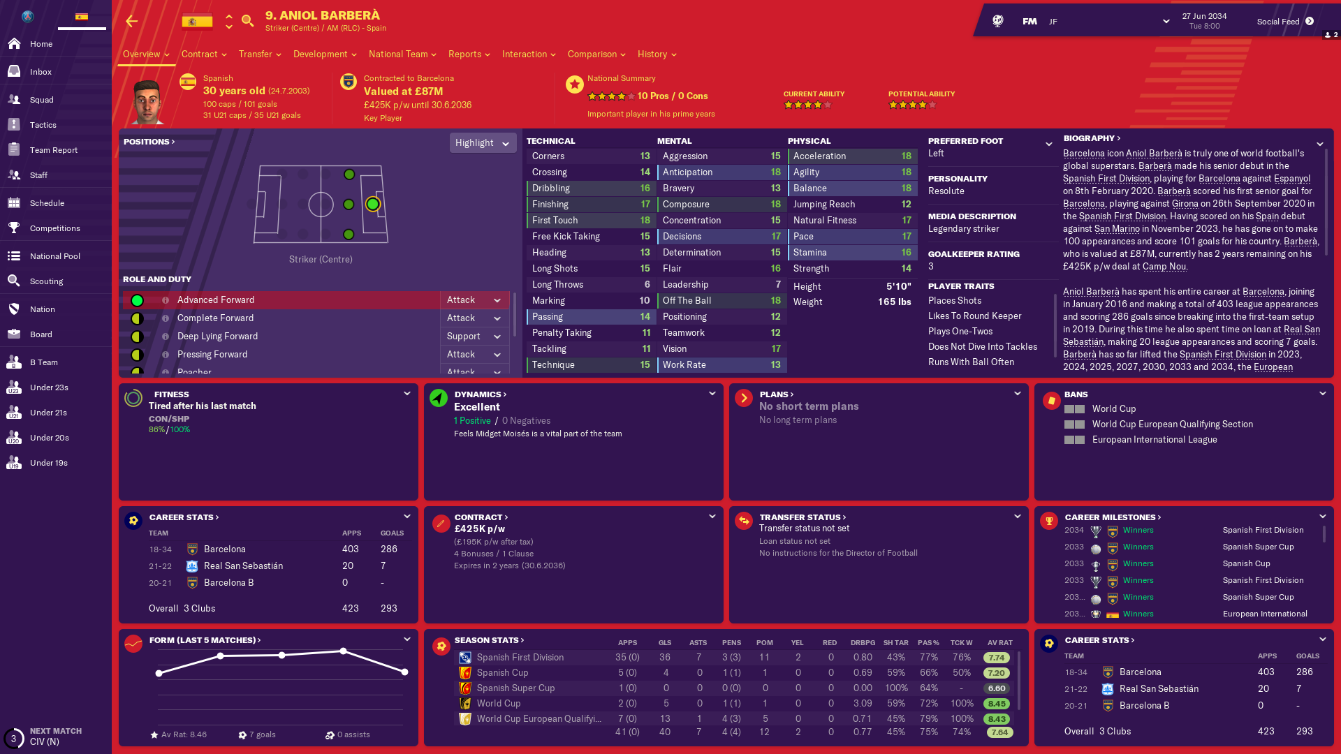 ATTACK: Here is where Spain have a wealth of riches. Juan Francisco Perez plays for Man Utd. He’s basically the Bruno Fernandes of the 2034 Utd line up. He can play central midfield but is better unleashed as an AMC. He’s a bit of a luxury player but he can win games on his own. Moises, my tiny winger (he’s 5’2”, a pocket rocket), is a bit of a livewire. He’s 31 and reaching the end of his career but in my Barca season he was brilliant when he was fit. On the other side is Ale Rioja, a man named after two things I love to drink. He’s keeping the equally exciting Angel Botia, of Real, out of the side. Up top there is an embarrassment of riches. Oriol Cardenas played for me at Dortmund. He’s 6’6” and one hell of an impact sub. I’ve also got Asier Ramos, who tore up Ligue 1 last year. Finally Aniol Barbera is the best player I’ve ever had.