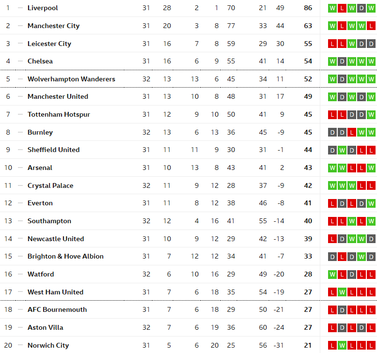 I’ve not seen much else because of work and other shit but here’s the table. I guess Liverpool won the league. Big celebration by the fans, including setting fire to the Liver Building and ignoring social distancing.