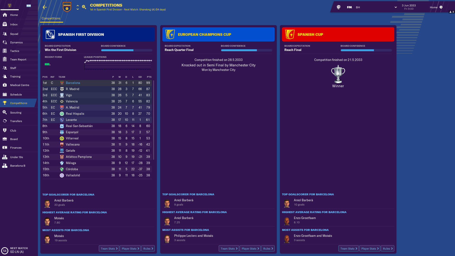 I played out the season. Barcelona won the league and cup double. Cup wasn’t as easy as expected thanks to it going to extra time but my boy Aniol Barbera (who scored 51 goals this season) popped up with a winner in 116 minutes. Aside from a tired team, competing 3 days after a major Champion’s League game, getting spanked 4-1 by Real Madrid they went unbeaten in domestic football. A solid year. I said I’d only stay on at Barca if they won the Champions League though and sadly Man City took them out in the semis. Another 4-1 in the first leg before a dramatic comeback was stifled by Chinese superstar Fu Xingchen netting. 3-1. 5-4 to City overall and a tad unlucky considering how good City are.