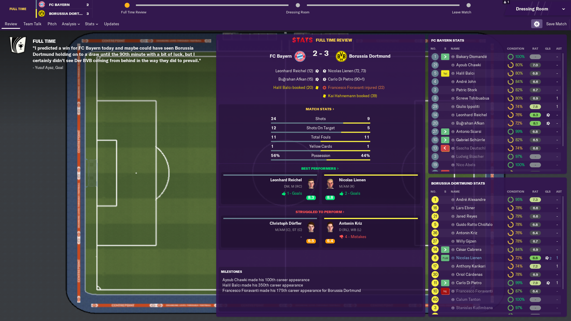 Greatest comeback of all time. Bayern all over poor Dortmund and 2-0 up early doors. Dortmund slammed that door shut with an epic defensive performance, and zero shots on target, until I stuck another striker on with 20 minutes left and holy shit, what a game. I know it’s only a video game but I was still buzzing an hour after this happened.
