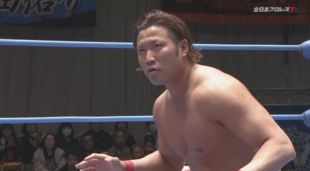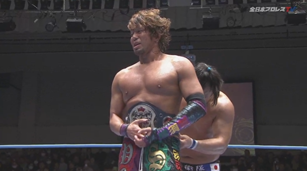 The match starts to hit a higher gear but Zeus gets dinged on a big backdrop driver and seems to be a bit confused as to where he’s supposed to be. Suwama helpfully tags in the throat with a lariat and the ref calls it because Zeus is fucked. Definitely the right call from the ref because Zeus didn’t know where he was or what he was doing. A shame as the match was just picking up.