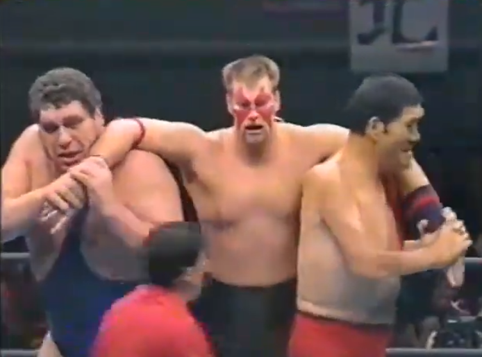 Nitron decides to loudly sell here. “AAAAAAARRRRRGH. AAAARGH. ARARRRRAAAAARGH”. Alright, Iron Mike Sharpe, settle down. Andre, as pointed out before, is very immobile by 1990. Normally the opponents do the work so he can just strike awe into the crowd. Here, the opponents have no idea what they’re doing. The best wrestler in the match is Baba, who is into his 50s and almost totally immobile.