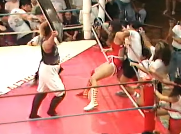 Post match Aja Kong beats Minami all over the building and throws chairs at her. There’s a great bit where the referee tries to stop her, and she hits him in the head with that metal sign. CLONG! This was a wild match. The in-ring was great, but the DQ finish does rather taint it, even if it eventually became a good storyline for Minami. Incidentally, Minami is a great worker. Her selling is exemplary.