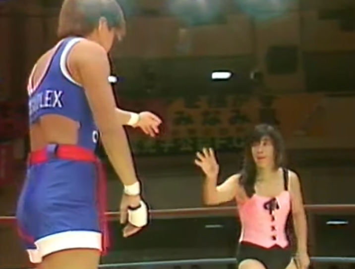 Grizzly is a brawler, whose career didn’t run for long. She retired in 1990. Hotta still wrestles now (2024). I don’t know what they’re singing but the sound of schoolgirls singing at wrestling is awesome. More of that. Inspiring the next generation. Hotta is one of the snuggest workers you’ll see (from this era anyway). Her kicks are stiff as fuck. Grizzly seems reluctant to take bumps and almost every time she hits the mat; it’s by sliding down the buckles. A big corner kick drops her in similar fashion and Hotta wins via KO. Great kicks in this from Hotta but her spin kicks all missed, and Iwamoto struggled throughout.