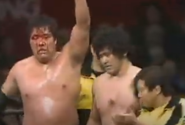 Yatsu finally gets the upper hand on Tsuruta, only for Tenryu to run Choshu into the rail again, ruining those ribs some more. With Jumbo bloodied, he becomes the weak link. Yatsu gets the Sharpshooter only for Tenryu to come flying in with a lariat, which is so OUTTA CONTROL, he flies into the ropes afterwards. Yatsu gets picked off by Tenryu and he finishes with the powerbomb to retain. This was a bloody, heated brawl.
