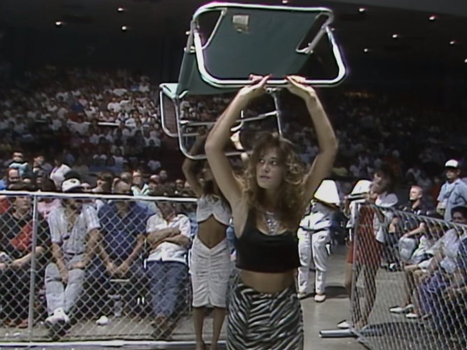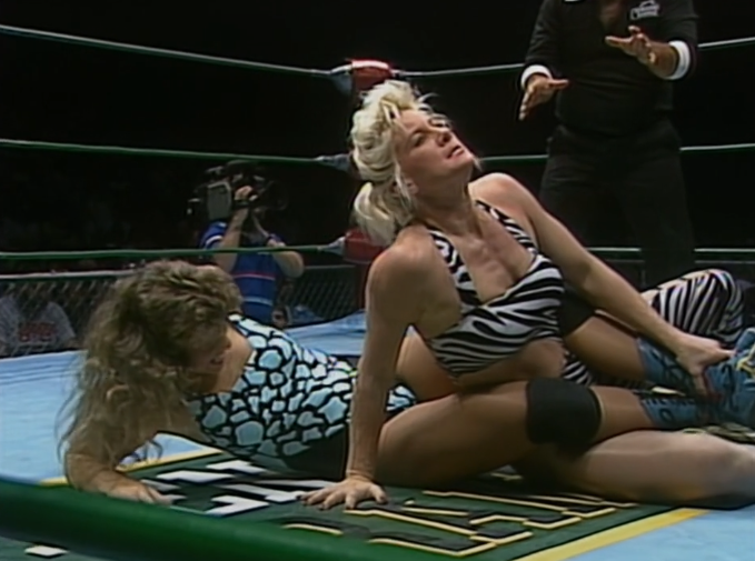 Unfortunately, she’s even less experienced than Madusa but she looks like a natural…at some things. It’s weird that she’s good at hard things but less good at the basics. Although the 1990s would produce a whole raft of guys with bad basics who could do cool shit. Mimi would go on to a minor film career; co-writing and starring in a lot of DTV martial arts films in the mid 90s. Sylvia is easily the least interesting woman in this. She looks like a model and wrestles like a model too. She’s Robert Fuller’s wife and has basically no training. The finish is a disaster with the referee fucking the count up. Madusa has a pin on Wendi but the idea is Wendi gets a shoulder up. They keep wrestling and improv a finish, but the ref won’t count it. Oh man, fuck you bitch. What a disaster this was. Wendi demands the title match afterwards, which would make more sense if she’d pinned her. Mimi looked like she could have been a big star based on this though.