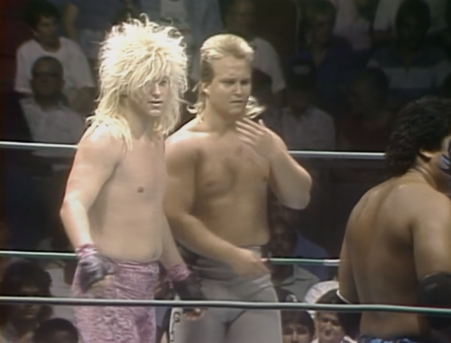 Baxter comes in with unbelievable hair. You can tell glam rock is making a comeback around this time. Every Rose Has its Thorn came out a few months before this. Just saying. Both jobbers make horrible mistakes. Baxter is late dodging a punch, causing a mess in the corner and Odyssey struggles to take a clothesline. SST get fed up and beat the shit out of him. If you can’t take a bump, you’re going to get bumped. Superfly Splash finishes Ray off.