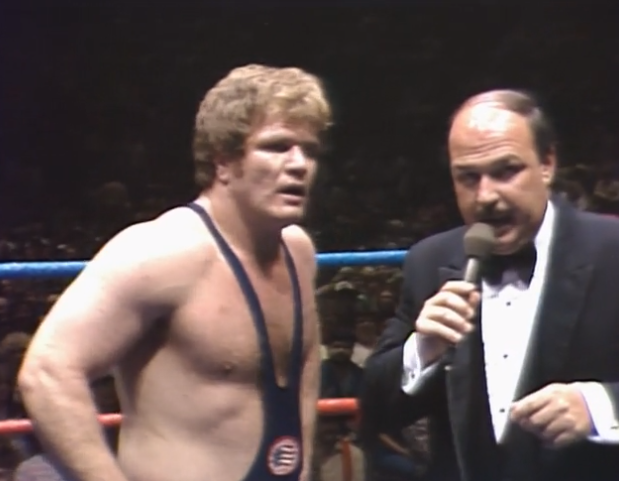 Rheingans was high school chums with Eric Bischoff. He was an Olympic wrestler, and missed out on a second Olympics, in 1980, due to the USA’s boycott of the Moscow games. As a pro he has a lot of peppy babyface energy. Stone is a pale, slightly hairy, boring jobber. I’m reminded, a few minutes in, that wrestling was sensationally boring in the early 80s. Rheingans getting all fired up is interesting to watch. He’s playing to the back row. Rheingans finishes with a gutwrench suplex. This was very dull.