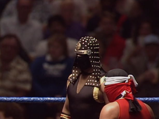 This is the 80s, so ninjas are cool. Or at least cool enough for Verne Gagne. I always thought DJ Peterson had a decent look. He looks like Terry Allen, only older. His in-ring doesn’t compare. He’s rough around the edges and finds anything complicated absolutely beyond him. Sadly he passed away in a motorcycle crash in 1993 or he may have ended up working for the WWF in their period of struggles. Although I’m sure Vince would have turned him into an actual DJ. Or a painter-decorator, pizza chef, pet shop owner or some shit. That Dave Peterson, he loves painting animals on his pizzas.