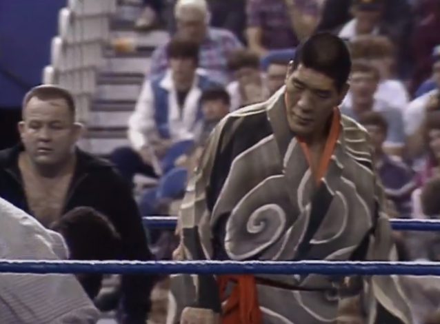 Zybszko has a ninja in his corner. That’s Ryuma Go. Ninjas weren’t really popular in pop culture around here. 1986 is a tough year for wrestling as a lot of combat movies took a back seat to comedies and sci-fi. The biggest action movies of 1986 were Top Gun, Platoon, The Fly and Aliens. There’s not much you can steal from that. Military gimmicks were always a thing, but Platoon was bleak. Maybe someone should have become a Colonial Marine? Oh wait, Karate Kid Part II came out in 1986 too, so expect more karate-based gimmicks.
