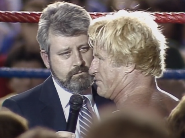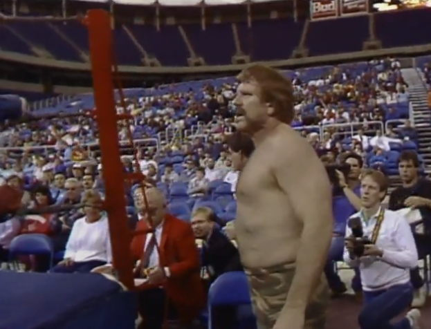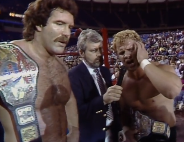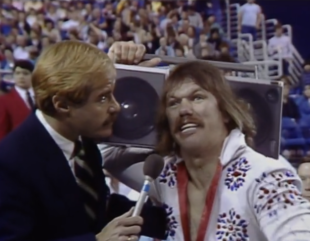 Why is Brad on all these AWA supershows? He’s so dull. They try and spin this is as USA vs. Evil foreigner contest, but no one cares. Verne probably hadn’t heard of Glasnost. If he had, he probably thought it was something hippies smoked. Brad gets a gutwrench belly to belly for the win. This was tedious and a terrible choice for an opener.
