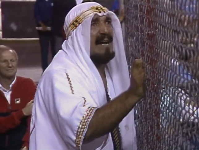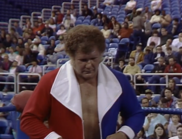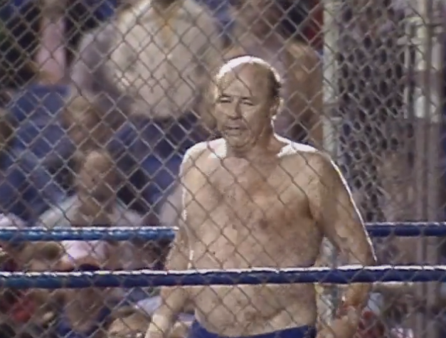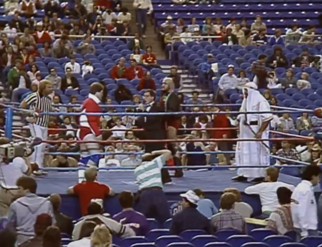 Snuka is replacing an injured Jerry Blackwell. In a cage match? He’s coming off the top, boys! If the faces win, Verne gets ten minutes in the cage with Sheik Adnan Al-Kassie.