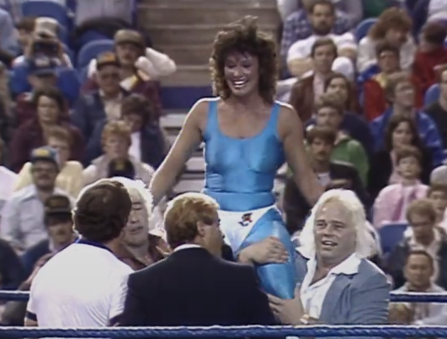 Women’s fashion feels like it changes more dramatically than men’s fashion. Between the hair and leotards, this screams 1980s. Candi is the women’s champion, having won it back from Sherri Martel. Sherri would win it back, using this match as a springboard, and keep the title until she left the company in 1987. Luna has a great look with a pink mohawk. She’s taken on board the Japanese approach. Rod calls her “Leona Vachon”. Swing and a miss Rod. “The action is fast and furious” says Rod as they all hug the ropes. Strike two, Rod. They slowly whittle the numbers down. Nobody gives a single shit. Despina Montagas, from Greece, catches the eye and hits a nice little powerbomb. She married Tarzan Goto!