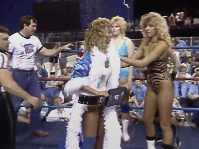 This is a ladies’ battle royal. Some of the participants include Debbie Combs, Joyce Grable, Misty Blue Simms, Candi Devine, Sherri Martel and Luna Vachon. Luna is really green. She debuted the previous year.