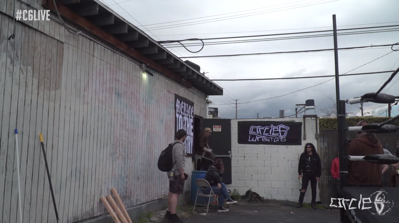The drama continues as it’s revealed the show is outdoors and it’s RAINING. So, they’re late starting. Keeping in mind the first two shows were designed to slot between Santino Bros and Bloodsport. So, if you were watching at home it would fill that void. Now people will be turning over before the show is finished.