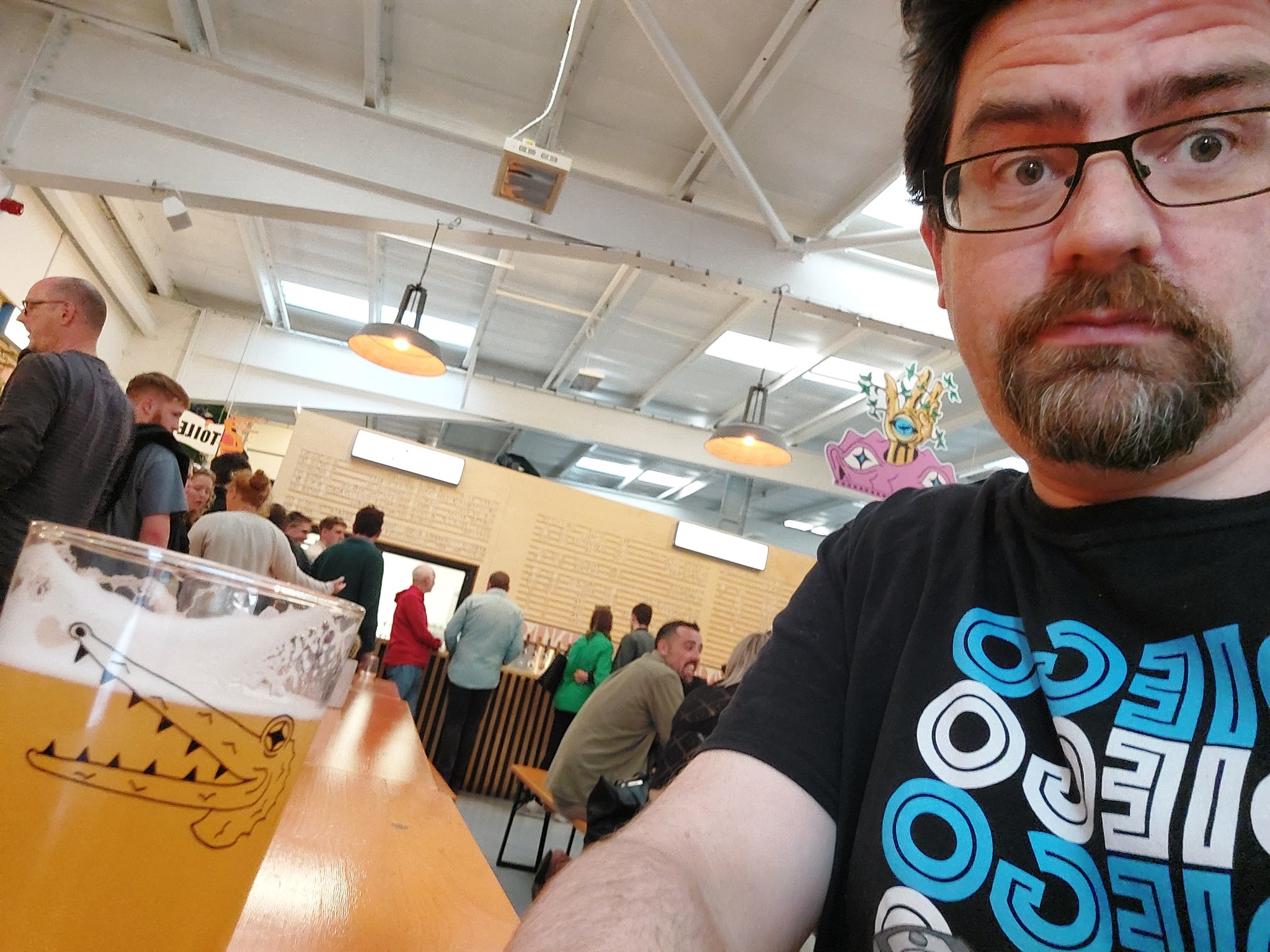 This is on an industrial estate near the train station and unless you know it’s there, you would never know it was there. It’s hidden away but as you walk through this deserted estate you gradually get the feeling something is happening nearby and then turn the corner and wham. Beer garden, food truck and after negotiating our way through a maze of tables into a massive, cavernous hall with all the beer making equipment on one side and a huge bar at the back. I called it “industrial craft” on my check-in.