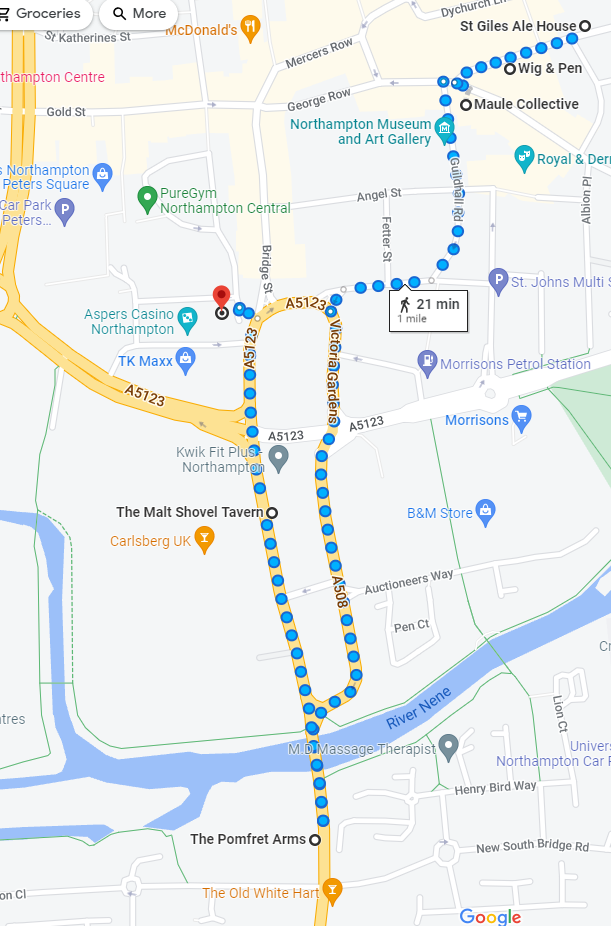 As you can see from my Google maps route it was all close together. I would recommend all of the bars I went to. They were all really good. The best was the Albion Brewery bar. It had a brilliant range, great building and I’m not just saying that because it was when I was at my drunkest. All of the pubs had something to recommend about them. The Maule Collective was the only new age craft place although St Giles Ale House was exactly like it sounds. The other places were more traditional pubs with a love of good beer. Go to Northampton and experience them for yourself!