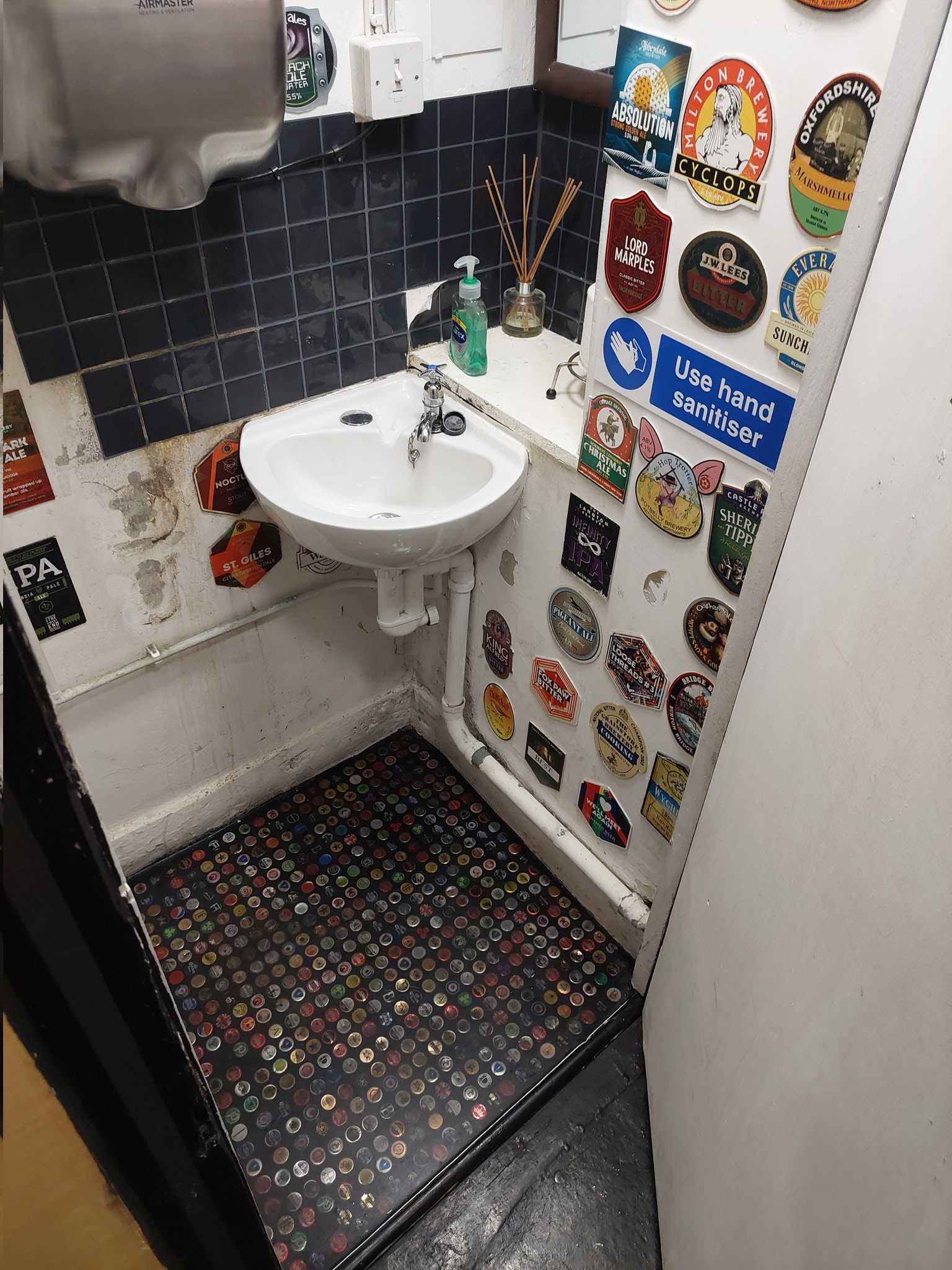 They have their menu on a TV that hangs on one wall, the other walls are covered with ale house regular stuff like local maps, beer mats and rugby nostalgia. They serve basic food, pies and whatnot, and there’s hops hanging from the ceiling. It is early but there are only two people in here. The landlord/barman steps outside for a smoke and I explore the rest of the pub. There’s a crazy toilet, which is one singular crapper with a floor made of bottle tops covered with a layer of Perspex, walls covered in beer mats.
