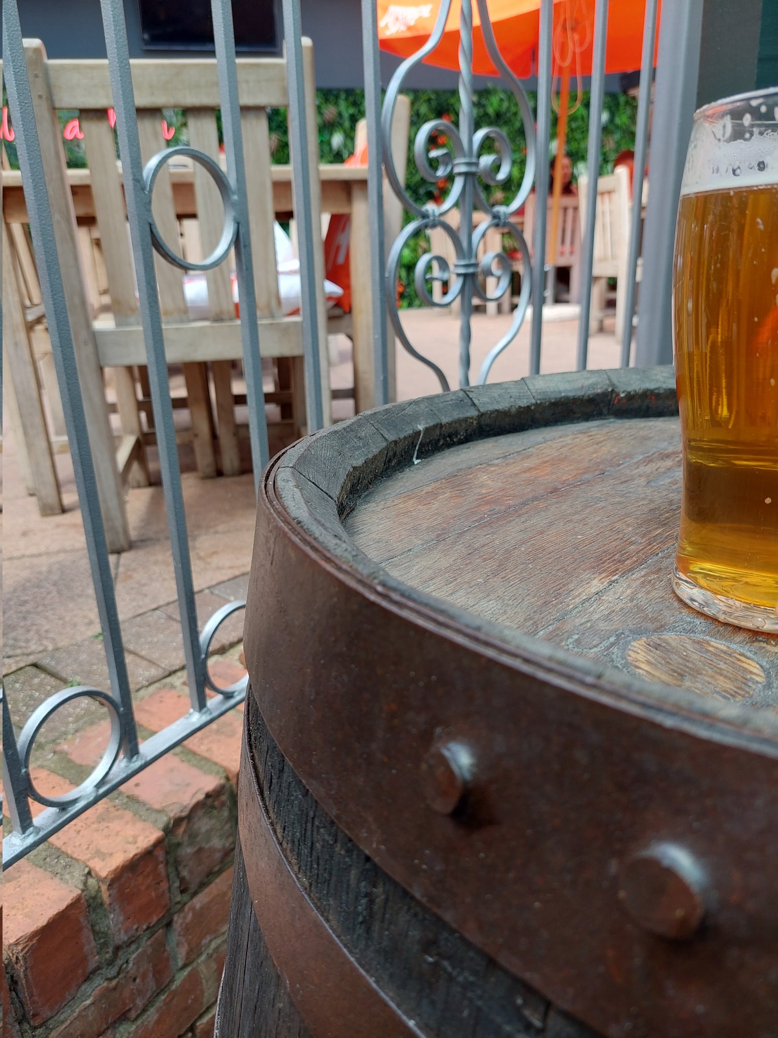 The barmaid is super friendly, and we talk about my wife’s beer mat collection. She even goes to find another one for her. The bar is a long curved deal allowing access from different angles. It’s a bit stuffy in there so I head for the beer garden. They have a lot of tables but most of them are in direct sunlight. I opt instead to sit up to a barrel with WIG on the side of it. There’s one opposite that says PEN.