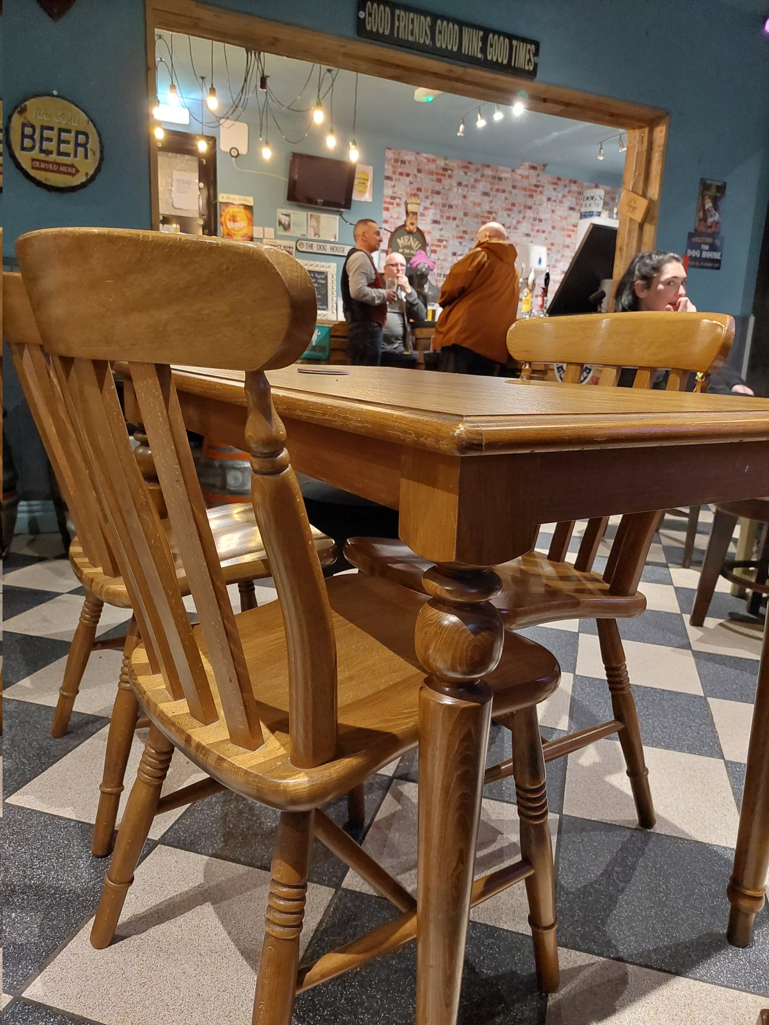 This is the inside of the pub. Through the archway there is the bar. A few regulars propping it up and dancing to Madness. It felt like being invited into someone’s front room. Someone who had a lot of mates. The music was controlled by an Alexa and at one point the room was singing along to “If You’re Happy and You Know It”. I was sat on a barrel admiring the décor. Each wall seemed to have something dog related on it. I wanted to take a picture of the wallpaper but there were people sat there.