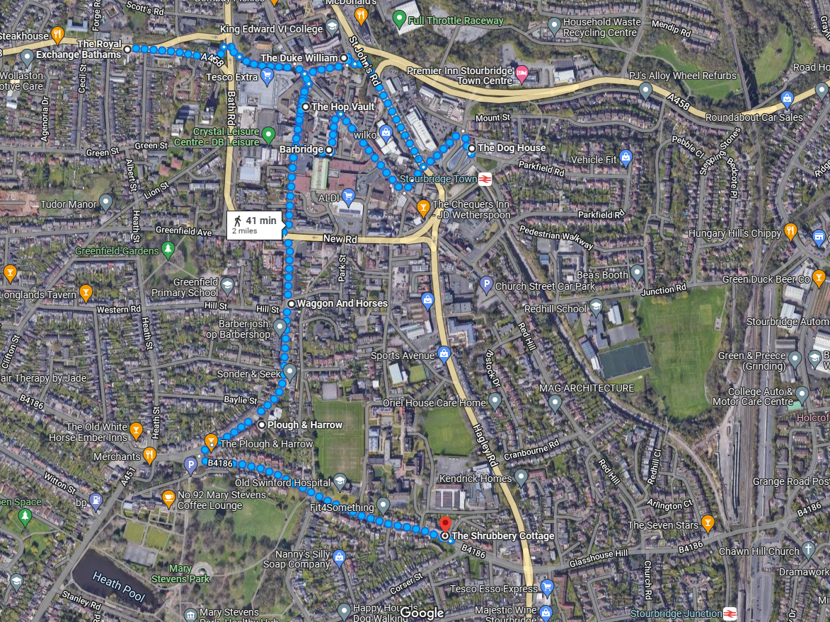 I leave you with the map, detailing our journey through Stourbridge. It was mostly fun. I’m so glad we went into the Duke William, my favourite pub in Stourbridge. The Hop Vault is also a delight. Everything else was good-acceptable, although the Waggon & Horses sadly blotted its copybook with some dubious cleanliness. If you use the train and follow our route, you can come in at Stourbridge Town and leave via Stourbridge Junction.