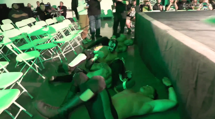 They do a dive spot on the hard-cam side and holllllyyyy shit there are no fans here. I finally get my concentration back and I wish I hadn’t. Lots of thigh slapping and ugly double teams. Border Control win clean too, which is “a choice”. *½