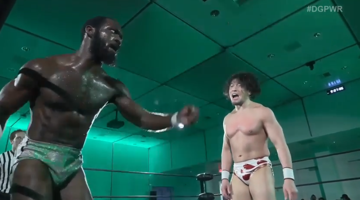 Kzy vs Shun is excellent. They do near misses into cool, innovative spots. The contest provokes some more traditional high-speed one-on-one action. It’s all smooth as silk. When DG wrestlers turn it on, it’s hard to pick faults. They even hold Minoura in place for a missile dropkick so he can’t move. That’s why it makes sense that’s he’s just stood there while Ben K mounts the buckles.