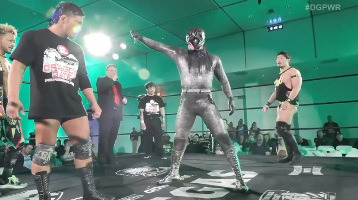 They start popping off big spots, but they have logic to them. We’ve built to this. Ben K twice slays it on the selling by missing his spots. The first time into the ring post, the second time into Minoura’s knee strike. Oh, it’s so fucking sweet. Crowd erupts into a “Dragon Gate” chant and they’re not wrong. The coordination and planning are elite here. As you would expect from DG. The double dive to set up the Ben K spear is perfect.