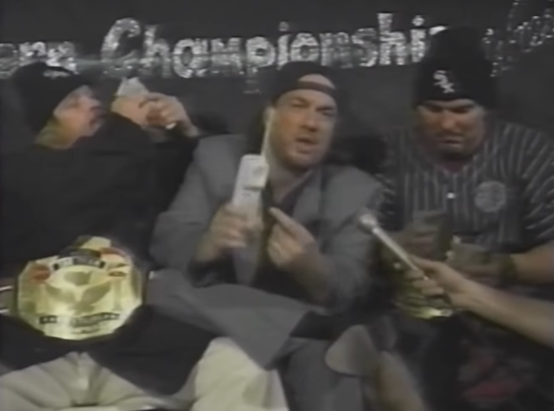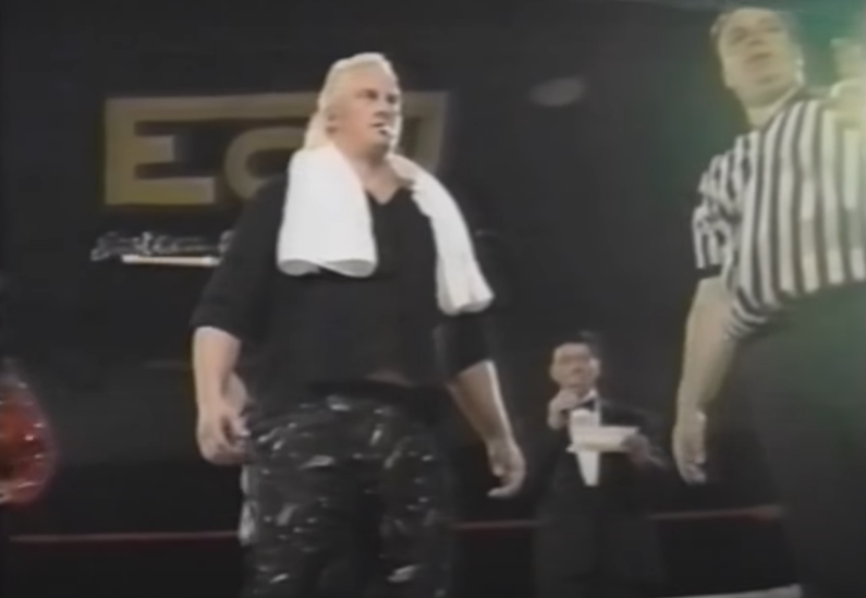 Peaches is Sandman’s wife Lori Fullington. Sandman has completely reinvented himself now. The surfer dude is gone and he smokes on his way to the ring wearing zubazz pants and a black shirt. Like if Gangrel was into beer not blood.