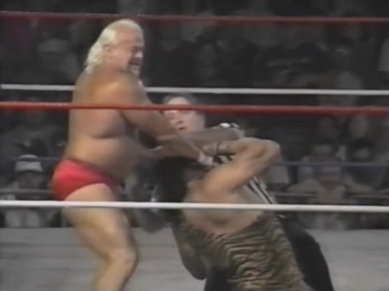 This begins Sandman’s obsession with the Singapore Cane. The cane was after Michael Fay, a US student, got caned as punishment in Singapore. It was all over the news, so Heyman turned it into an angle. The ladies get into a fight but Cairo drills Sandman with a DDT and Lori pins her husband. This was pretty bad but it was all about the caning not the match. *