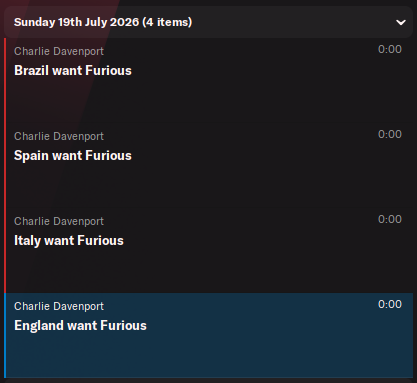 Germany and Argentina can sense I have historical hatred for their nations football teams. I could have gotten over it lads. So, the choice is Brazil, Spain, Italy and England. Brazil have lowballed me with the smallest wage package. Just £49k p/w. It’s also a tough ask. Their best players are all aging out. Allison is the best keeper at 33. Marquinos the best defender. Neymar is still their best outfield player and he’s 34. They do have Brenner, who has the holy trinity. Antony is a great winger. The squad depth is alarmingly poor.
