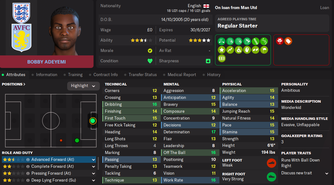 And here’s the big one. Sekou Mara is off to Man City. They offered me £51M and he wanted to go. He’s really not worth that much and I don’t need to replace him. Lagadec and Ings are fine. Unfortunately, that creates that ‘lack of depth’ issue again. To replace him I try and sign Benjamin Sesko, from Man City, and he doesn’t want to move. The fix is Bobby Adeyemi, a 20 year old newgen from Man Utd. He’s here on loan.