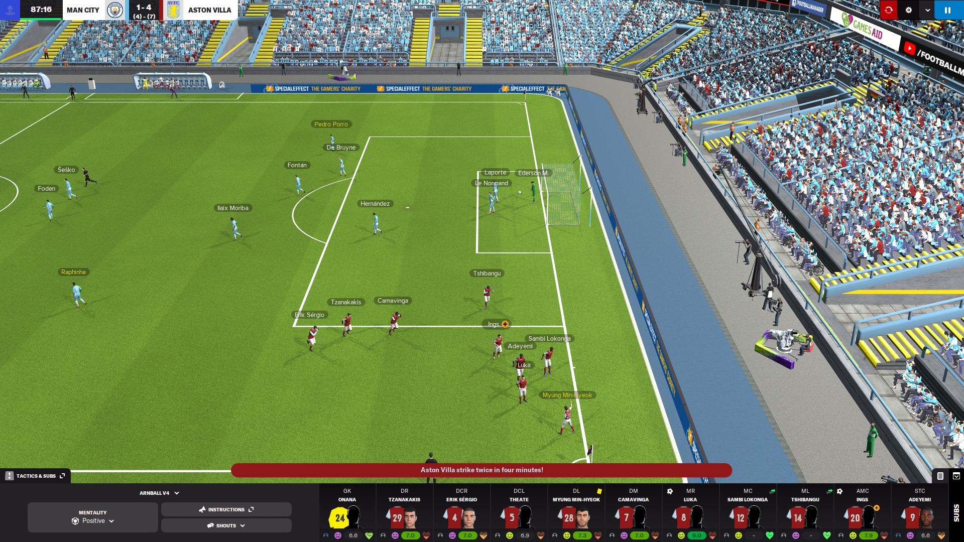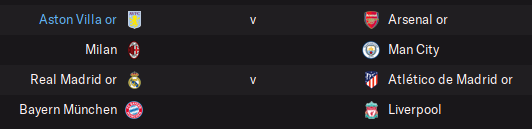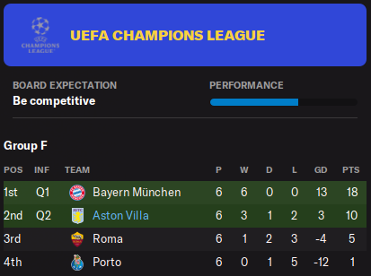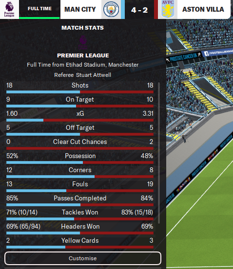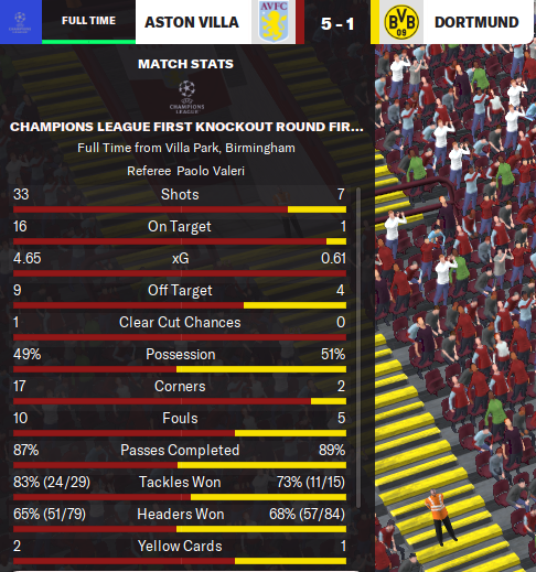 The first leg is a massacre. We hit the bar twice and had two shots blocked that were surefire goals. One of them with the keeper already out of play. Dortmund were lucky to escape with a 5-1 loss. An absolute hiding. Villa are good enough to compete this year. Dortmund were never going to win the CL with their current squad so we’ll take this. Next up is the Carabao Cup final. Our first ever final as a manager on this save.
