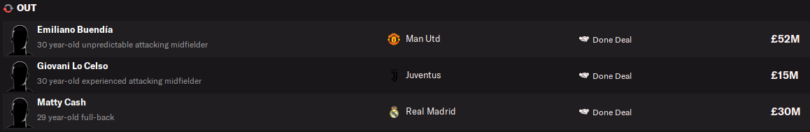 Departures; John McGinn is John McGone. He’s signed for Sporting Lisbon in a £6.25M move. He’s into his 30s and wasn’t playing. He’s still a good player but with Camavinga coming in his game time will be even more severely reduced. Marco Carnesecchi leaves for Sampdoria where he’ll be on loan for a year with a mandatory future fee of £2.4M. Marco was signed with the idea that he could grow into a first teamer but he got his knickers in a twist whenever I signed another goalie so he can fuck off. Ollie Watkins is off. West Ham gave me £14.75M and I took it. It’s only half what we paid for him but he’s 30 years old and hasn’t been great for me. You’ll be nothing without me Watkins. NOTHING.