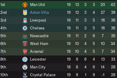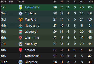 In the league, it’s all a bit mad this season. Everyone is losing games. Man Utd with five defeats would traditionally be out of any serious title race down the years and they have the least amount of losses. It shows how fiercely competitive the league is this season. As we hit February it’s Champion’s League time and Villa have Dortmund.