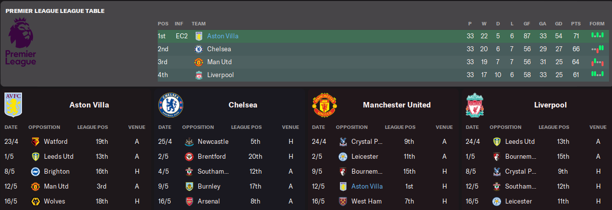 Is there a better feeling in FM than getting the “title race hots up” email and seeing yourself clear at the top? Of our remaining games the one at Old Trafford stands out. Chelsea finish with three straight away from home. I should probably be worried about Man Utd, especially if we lose on 12/5. Liverpool a full 10 points behind is fine by me and Man City are currently tenth. Tenth! Bobby Martinez working his magic.