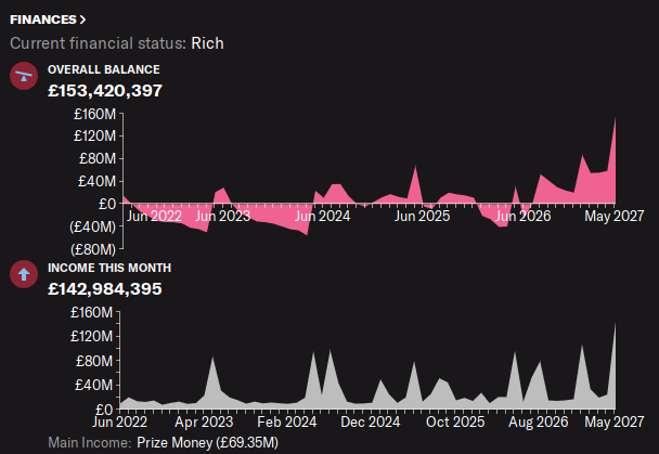 Incomings are Arsen Zakharyan, who I’ve loaned off Newcastle. I don’t think he’s actually interested in a permanent move. Newcastle are putting together quite the squad. Yusuf Demir joins for £25M from Man City. He’s a direct replacement for Lo Celso and doesn’t expect to play much. He’s got potential to improve into. Taylor Harwood-Bellis joins us as my centre back cover is a wee bit thin. He’s better than Francisco Sierralta, who’s my current #5 central defender. We also snag Brazilian keeper Clovis Alberto but his loan move to Barnsley, to get UK game time, falls through on deadline day, which is a bugger.