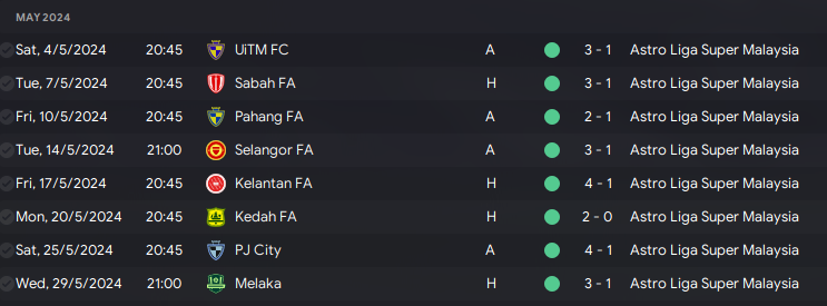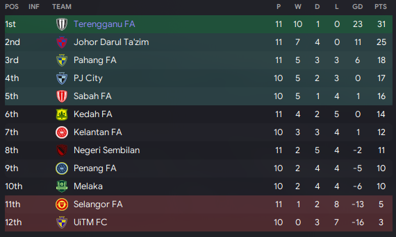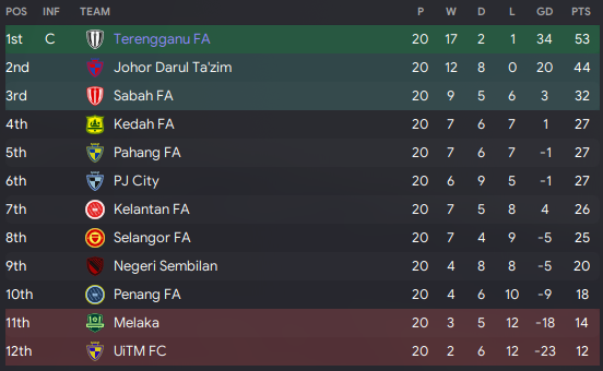 The injury comes just before the half way point of the season and we’re killing it. We drew with Johor in the opener and have won every game since. Johor have slipped up a bit, so we’re six points clear. All we need to do to secure a title is get better results than Johor until the end of the season. At the other end Selangor, the third best team in the league, have had a fucking shocker. They only won their first game of the season in game week 11.
