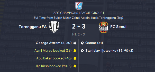 An ongoing issue for Terengganu is a lack of available foreign talents. Which is why I’ve hung on to Habib Haroon for dear life. The club’s reputation, and indeed my own, are not sufficient to attract talented Asian players. Of which we have room for one. Instead I find myself taking Jack Rodwell on trial. Is he part Chinese maybe? No? Second game in the Champion’s League is Seoul (A). This isn’t as close and they blow us away 3-0. Seoul are the best team we’ve got in the group and that shows where we are overall. Simply not able to compete at this level.