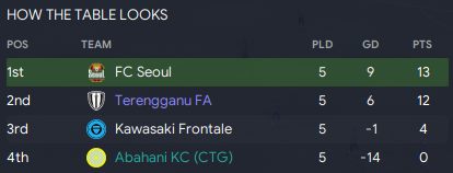 With one game to go in the Champion’s League group stage it looks like this. We’re one point behind Seoul and playing them at home in the final game. We win, we’re into the knock out stages of the Champion’s League! However, I’m aware Seoul are significantly better than we are.