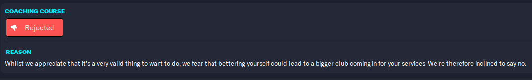 I have a full star reputation! Wave goodbye to the half star forever, I’m a full star kinda guy. Me, my National C licence and my one-star reputation are ready to take on the world. While I’m scrapping around looking for free transfers, Johor are out here making £1.4M bids for players. How are they so damn rich? Speaking of rich, seeing as we’re now solvent again, I think I’ll do my National B training.