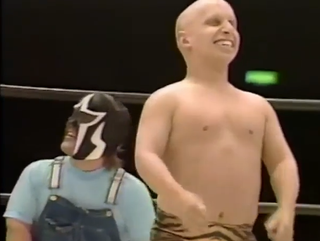 Onita wasn’t afraid to show wrestling as the circus that it is. Here are the clowns; noted midget performers Jackson (Dink) and Little Louis. When the WWF got into financial trouble, they started chucking the little guys onto shows and both these two worked there extensively in the early 90s. Little Louis played “Queasy” in that one Survivor Series match.