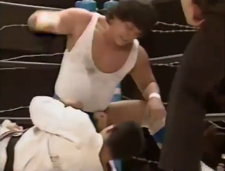 Wakita is Super Delphin in one of his earliest gigs. Fumihiro Asako (it’s spelled Fumiharu on the graphic) is an FMW mainstay, perhaps better known as Sambo Asako. He’s a big fat guy in a gi. This should be a replay of the previous match, but Asako is too fat, so Wakita takes his legs and tries to tap him out. This is fun in its own way as Asako allows himself to be beaten up by a rookie. Then he just catches Wakita on a crossbody attempt and the SUPER DRIVER finishes. The Super Driver is just a powerslam but because he’s so fat, it’s superior to a standard one. This was fun! **½