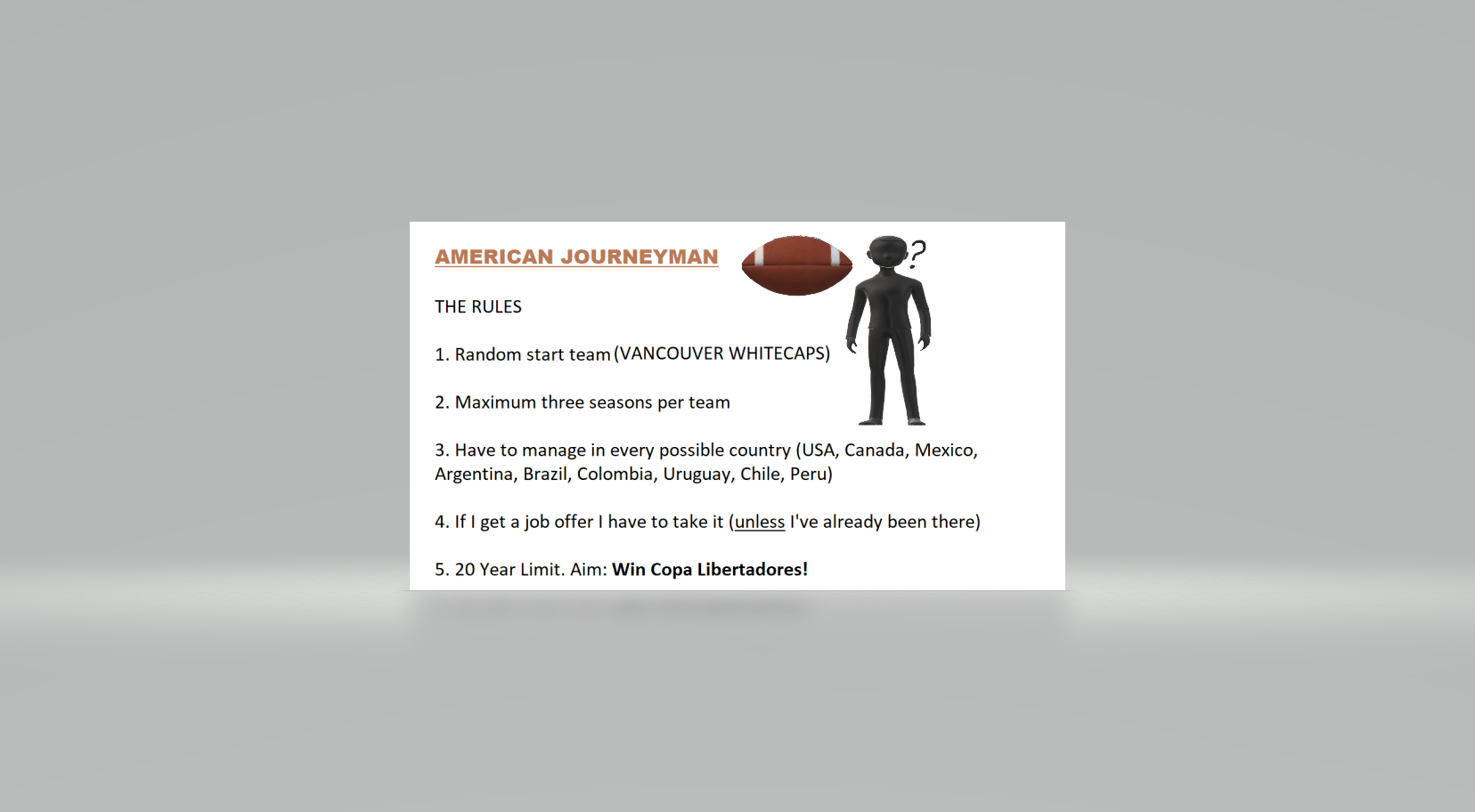 I had to admit it. I didn’t understand the rules of MLS. Player registration was a minefield. The salary cap flustered me daily. How could I be under budget one minute and then suddenly overspent? How come some teams are allowed more foreign players than me? What the fuck is happening? I asked for more time, fully intending to scrape through one season and then quit.