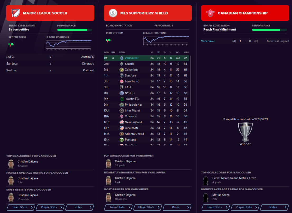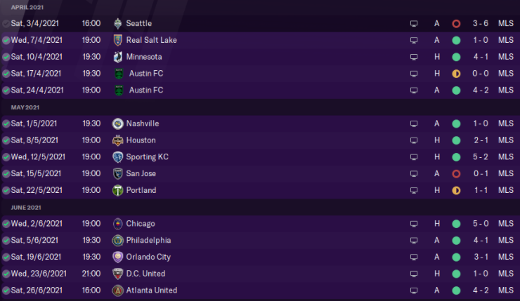This was all done on stream (I stream on twitch.tv/arnfurious) so there was no save scumming involved. With my good luck charm Tobi watching on we ran roughshod over all and sundry. Apart from San Jose. We don’t talk about San Jose. With a formational change to what has now become my traditional formation, which I’ve used ever since to devastating effect, Vancouver became MLS’ best team.