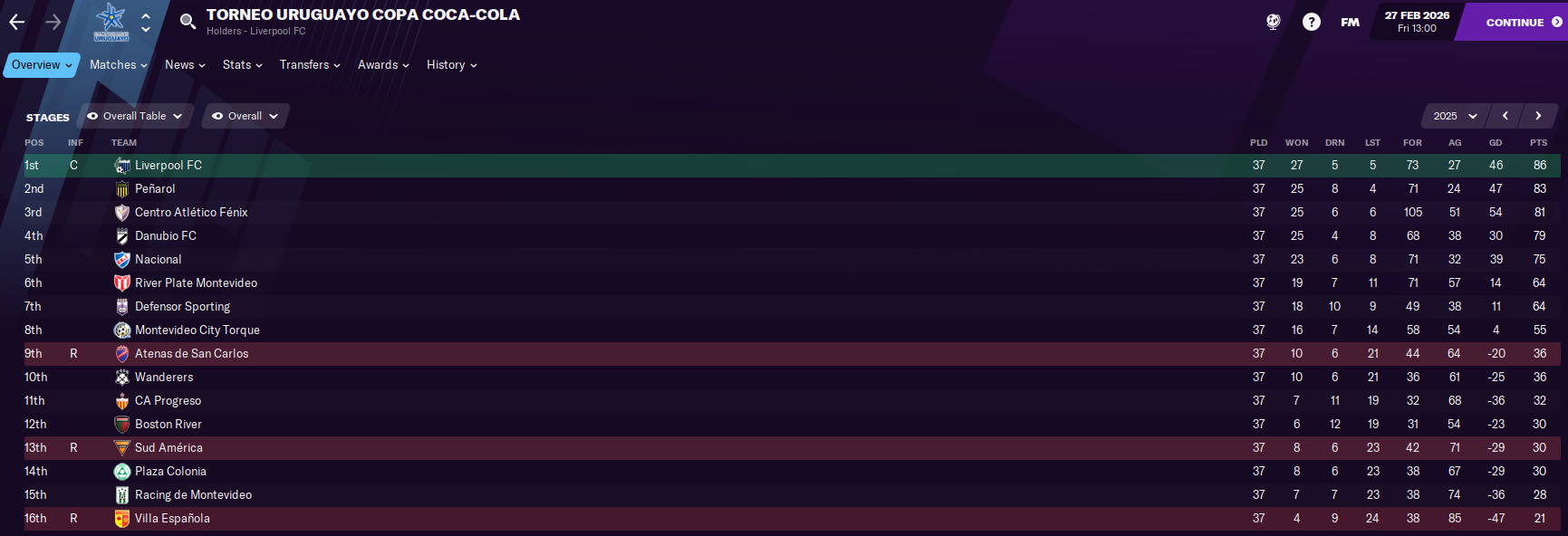 I don’t know if this is big enough for you to see but we scored 105 goals. Liverpool, who won the league, scored 73. Another year in Uruguay and Fenix would have won the league. I’m 100% convinced of this. They just needed a little more time and some improved quality in a couple of positions. The team was massively better between the first and second halves of the season alone. But I couldn’t stay another season because I got offered one of my dream jobs.