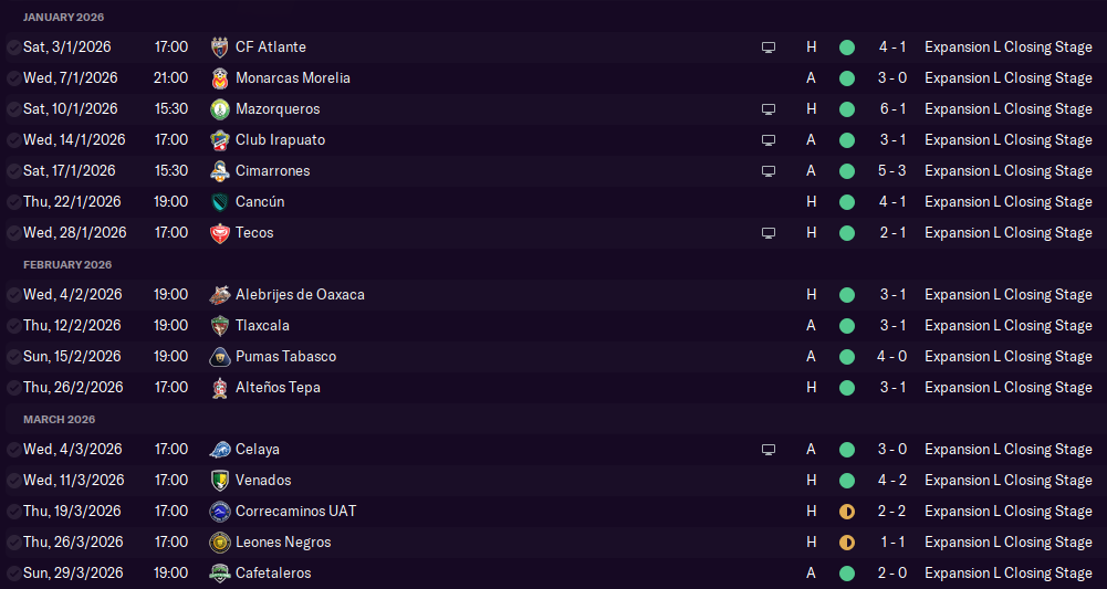 As with Tempico, Zitacuaro are dreadful and come in very defensive. Gutierrez nets early but VAR, or the lino, one or the other, rule it out for offside. The defensive wall of Zitacuaro results in a first half with THREE SHOTS total and one highlight. Five minutes into the second half Christian Morales pops up at the far post and fuck me, we’re losing. Gutierrez scores again and again he’s offside. This time by a mile. No VAR required. And that’s it. First ever loss as Dorados manager against one of the worst teams in the league. I’d gone 20 unbeaten prior to this fucking shambles.