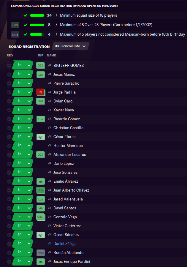I thought Mexico would be relatively normal but it’s not. You have to field three U23 players in every game and eight Mexican born players. I routinely play four foreign players and nobody has said anything. Maybe I’ll get hammered with a points deduction or something. Ah, who cares. Rules are for squares.
