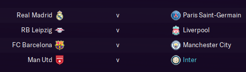 We draw Man Utd in the quarters and will play the winner of Leipzig/Liverpool in the semis if we can get past the Mancunian giants. We pass the board’s request for latter stages of CL football years ahead of schedule.