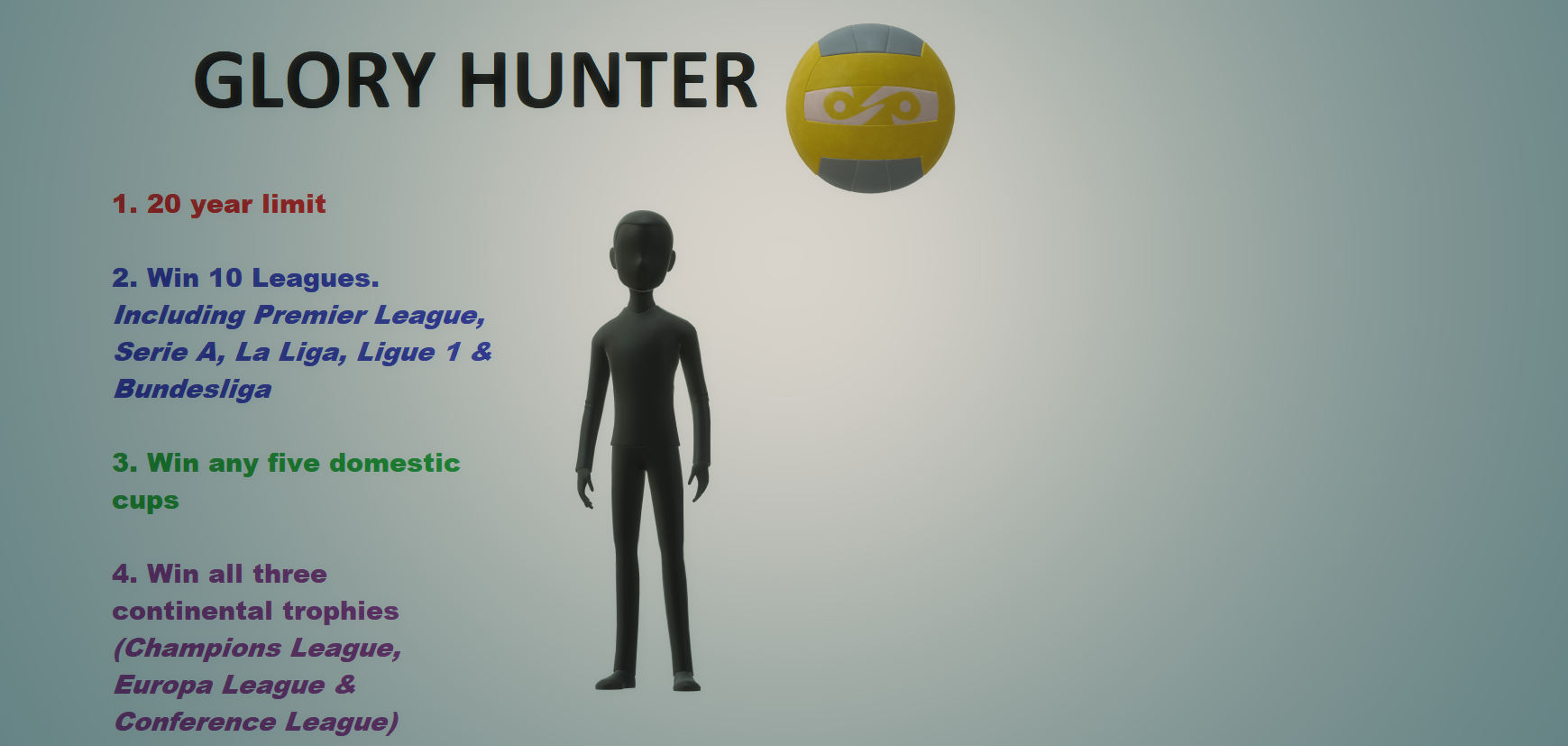 In my version I need to win ten league titles in the twenty years including the “Big Five”. I don’t have to win each of those leagues respective domestic cup trophies but I do need to win at least five domestic cups over the twenty years. Plus all the Continental competitions for a total of 18 leagues and cups over 20 years. Seeing as the traditional Glory Hunter is 14 trophies, albeit with the International ones thrown in there, I’ve given myself a slightly tougher challenge. Dropping International football is mainly a time issue. Playing through seasons with added International games is one of the things that slowed down my seasons on previous FM versions.